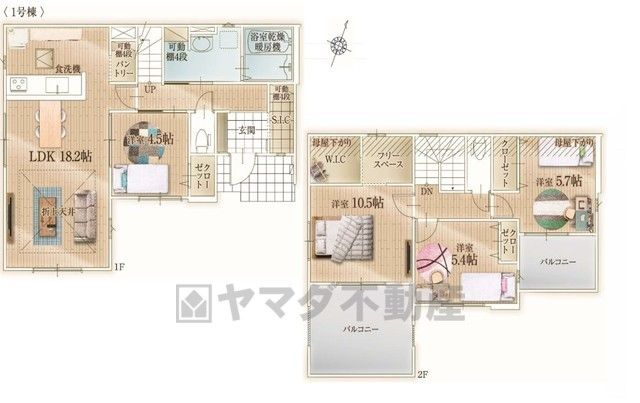 LDK18.2畳(1F)、洋4.5畳(1F)、洋5.4畳(2F)、洋5.7畳(2F)、洋10.5畳(2F) |