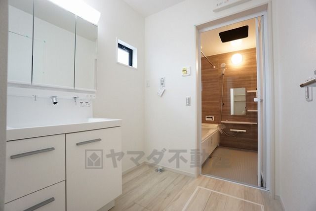同仕様写真。三面鏡つき洗面台。鏡裏にたっぷりとした収納スペースがあります。鏡を閉めてしまえば小物は見えないため、スッキリとした印象の洗面台にできます。