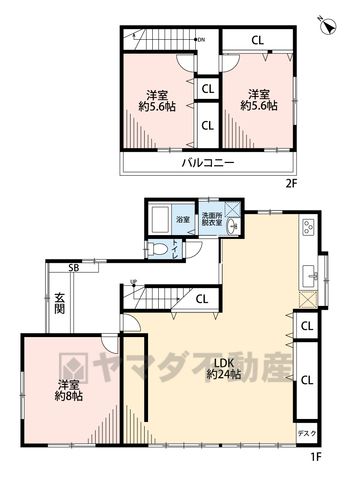 LDK24畳(1F)、洋8畳(1F)、洋5.6畳(2F) |