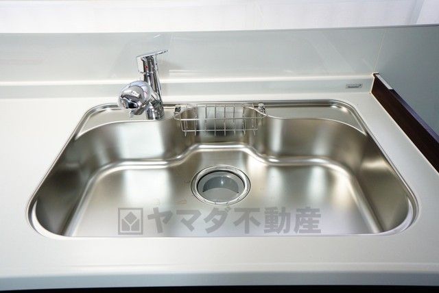 広々としたステンレスシンクには、洗剤やスポンジを収納出来るラック付き。広さも確保しているので、大きなお鍋も洗いやすいです。