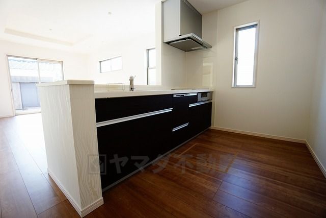 同仕様写真。リビングやダイニングからキッチン周りが丸見えにならない対面式キッチン。テレビ鑑賞や家族との対話がしやすく、ご家族の温かい時間を演出します。