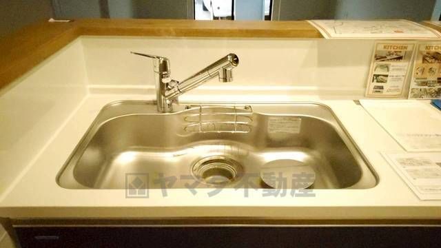 広々としたステンレスシンクには、洗剤やスポンジを収納出来るラック付き。広さも確保しているので、大きなお鍋も洗いやすいです。