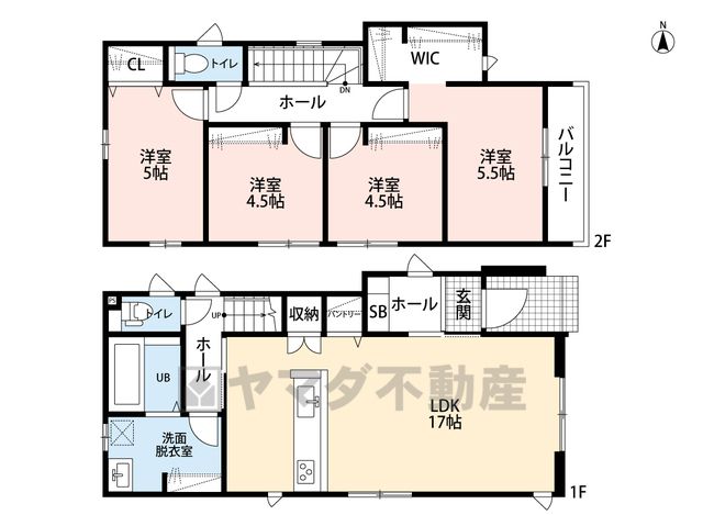 LDK17畳(1F)、洋4.5畳(2F)、洋5畳(2F)、洋5.5畳(2F) |
