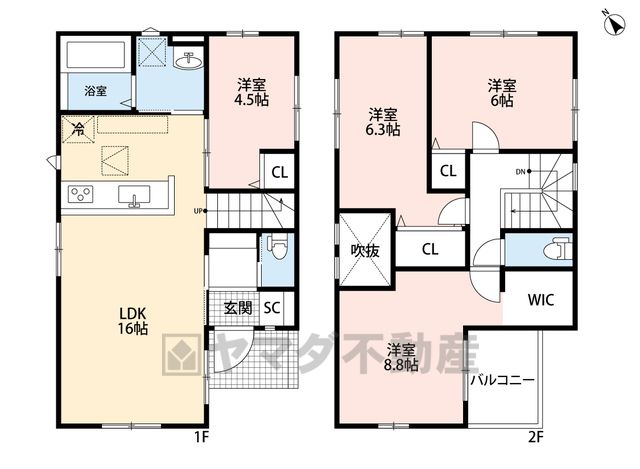 LDK16畳(1F)、洋4.5畳(1F)、洋6畳(2F)、洋6.3畳(2F)、洋8.8畳(2F) |