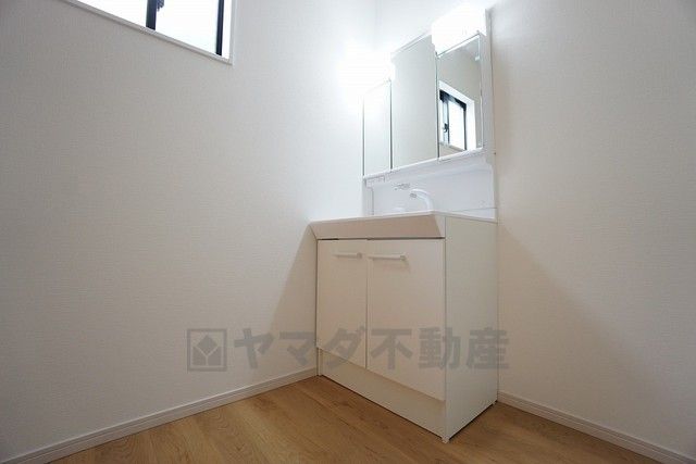 同仕様写真。三面鏡つき洗面台。鏡裏にたっぷりとした収納スペースがあります。鏡を閉めてしまえば小物は見えないため、スッキリとした印象の洗面台にできます。