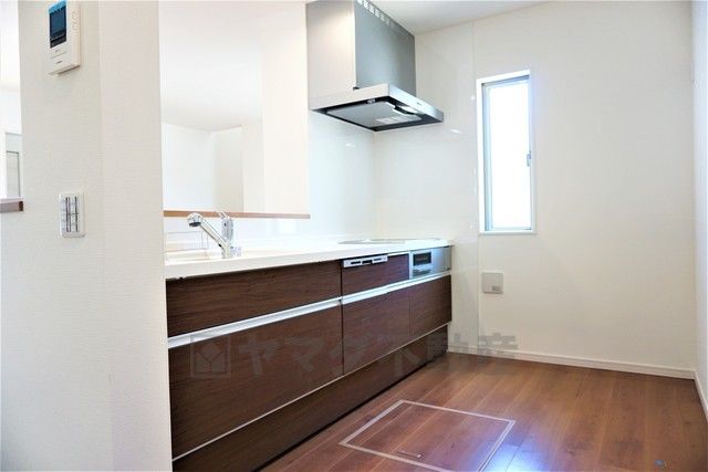 同仕様写真。リビングやダイニングからキッチン周りが丸見えにならない対面式キッチン。テレビ鑑賞や家族との対話がしやすく、ご家族の温かい時間を演出します。