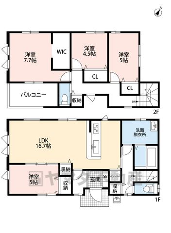 LDK16.7畳(1F)、洋5畳(1F)、洋4.5畳(2F)、洋5畳(2F)、洋7.7畳(2F) |