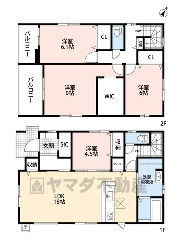 LDK18畳(1F)、洋4.5畳(1F)、洋6畳(2F)、洋6.1畳(2F)、洋9畳(2F) |