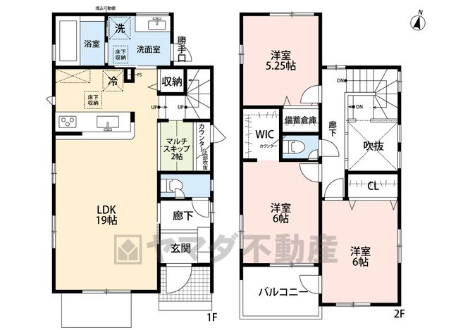 LDK19畳(1F)、洋5.2畳(2F)、洋6畳(2F) |