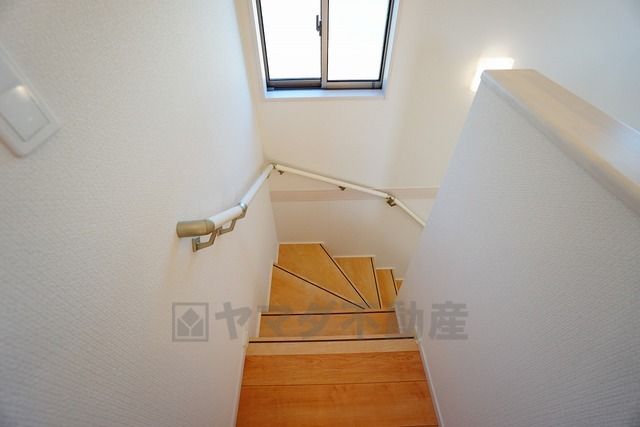 同仕様写真。小さなお子様やご高齢の方でも安心できる、手すり付き階段。段差も低めで設定されており、安全性にも優れています。
