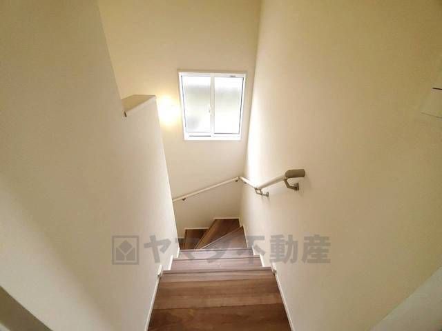 小さなお子様やご高齢の方でも安心できる、手すり付き階段。段差も低めで設定されており、安全性にも優れています。