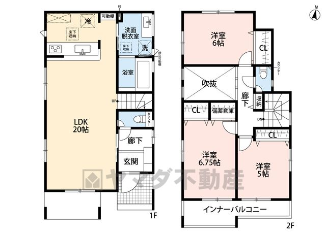 LDK20畳(1F)、洋5畳(2F)、洋6畳(2F)、洋6.7畳(2F) |