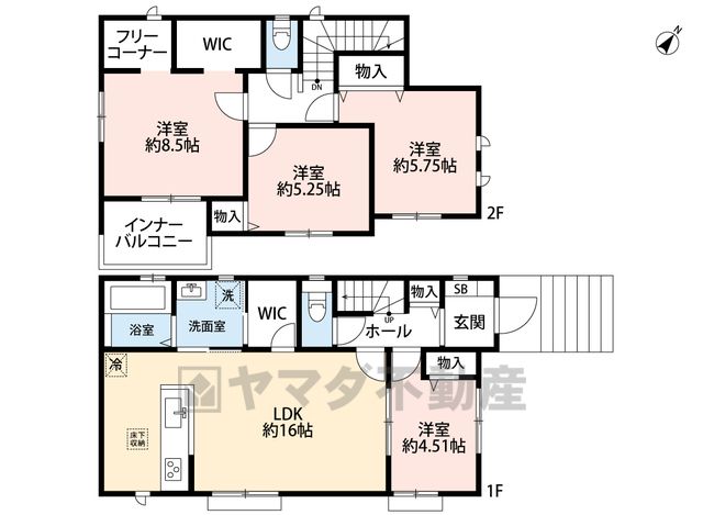 LDK16畳(1F)、洋4.5畳(1F)、洋8.5畳(2F)、洋5.7畳(2F)、洋5.2畳(2F) |