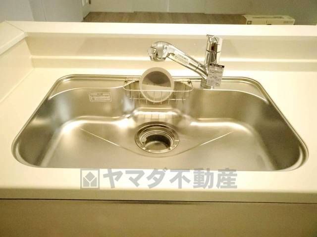 広々としたステンレスシンクには、洗剤やスポンジを収納出来るラック付き。広さも確保しているので、大きなお鍋も洗いやすいです。