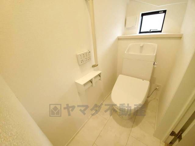 温水洗浄機付トイレです。節水機能もあるので、安心して使えますね。もちろん、1階2階の2ヶ所にトイレがあるので、忙しい朝にもゆとりができますね。