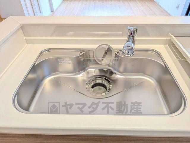 広々としたステンレスシンクには、洗剤やスポンジを収納出来るラック付き。広さも確保しているので、大きなお鍋も洗いやすいです。