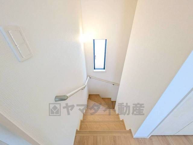 小さなお子様やご高齢の方でも安心できる、手すり付き階段。段差も低めで設定されており、安全性にも優れています。