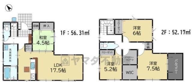 LDK17.5畳(1F)、和4.5畳(1F)、洋5.2畳(2F)、洋6畳(2F)、洋7.5畳(2F) |