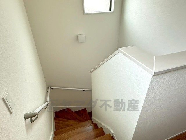 小さなお子様やご高齢の方でも安心できる、手すり付き階段。段差も低めで設定されており、安全性にも優れています。