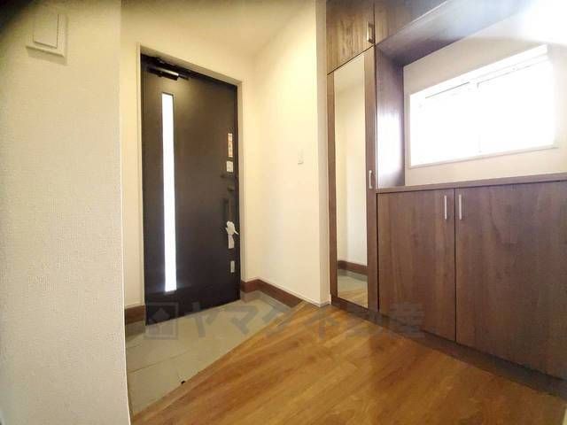 採光も考えられた明るい玄関です。シューズボックスは全身鏡付きで、お出かけ前にコーディネートのチェックが出来ますね。