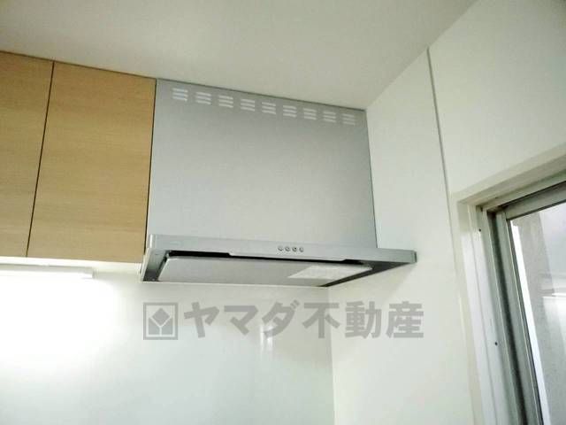 風量が弱・強と切替え可能なレンジフードが調理中の煙をしっかり吸い込みます。手元を照らすライト付きです。