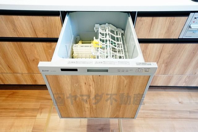 食事の後の手間を解消する食器洗い乾燥機付。冬場の洗い物で手荒れの悩みもなくなります。手洗いよりも節約できて便利。