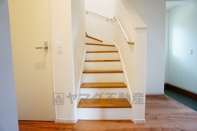 小さなお子様やご高齢の方でも安心できる、手すり付き階段。段差も低めで設定されており、安全性にも優れています。