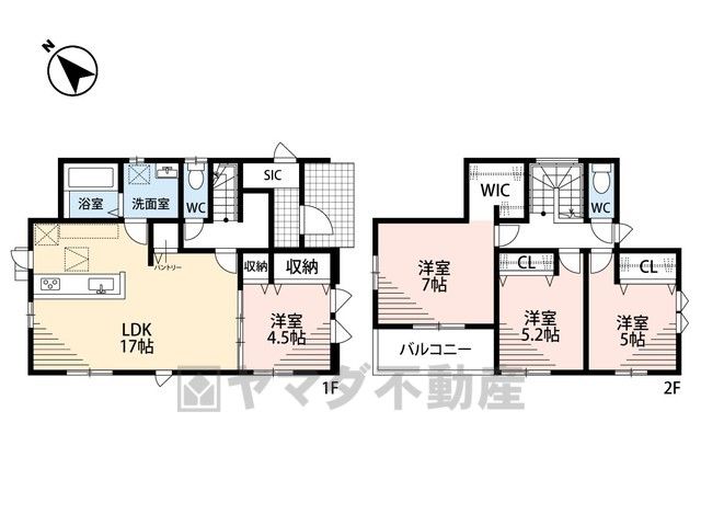 LDK17畳(1F)、洋4.5畳(1F)、洋7畳(2F)、洋5.2畳(2F)、洋5畳(2F) |