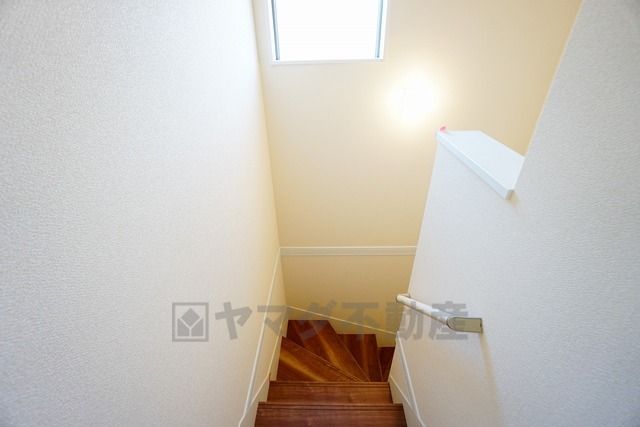 小さなお子様やご高齢の方でも安心できる、手すり付き階段。段差も低めで設定されており、安全性にも優れています。