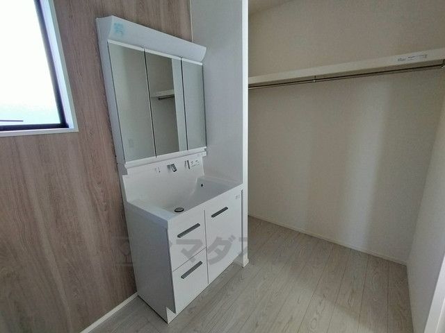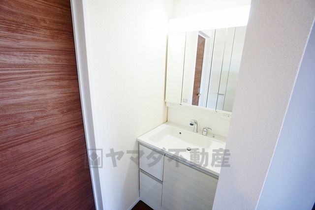 三面鏡つき洗面台。鏡裏にたっぷりとした収納スペースがあります。鏡を閉めてしまえば小物は見えないため、スッキリとした印象の洗面台にできます。