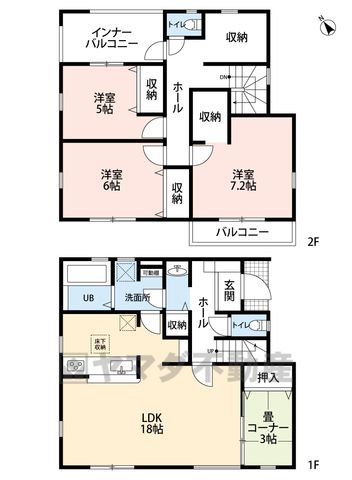 LDK18畳(1F)、和3畳(1F)、洋5畳(2F)、洋6畳(2F)、洋7.2畳(2F) |