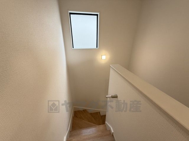 小さなお子様やご高齢の方でも安心できる、手すり付き階段。段差も低めで設定されており、安全性にも優れています。