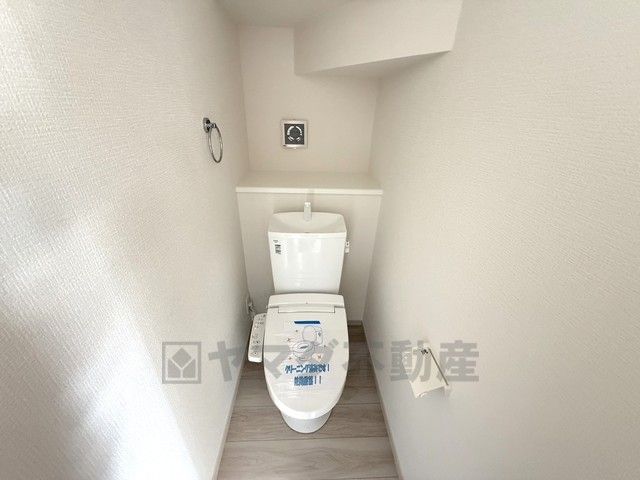 温水洗浄機付トイレです。節水機能もあるので、安心して使えますね。もちろん、1階2階の2ヶ所にトイレがあるので、忙しい朝にもゆとりができますね。
