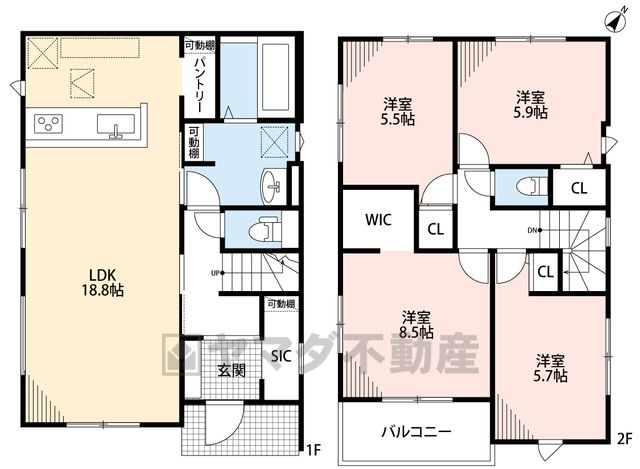 LDK18.8畳(1F)、洋5.5畳(2F)、洋5.7畳(2F)、洋5.9畳(2F)、洋8.5畳(2F) |