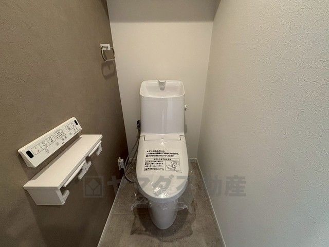 壁リモコンタイプのウォシュレット付き。すっきりした見た目で、トイレ奥の掃除もしやすいです。