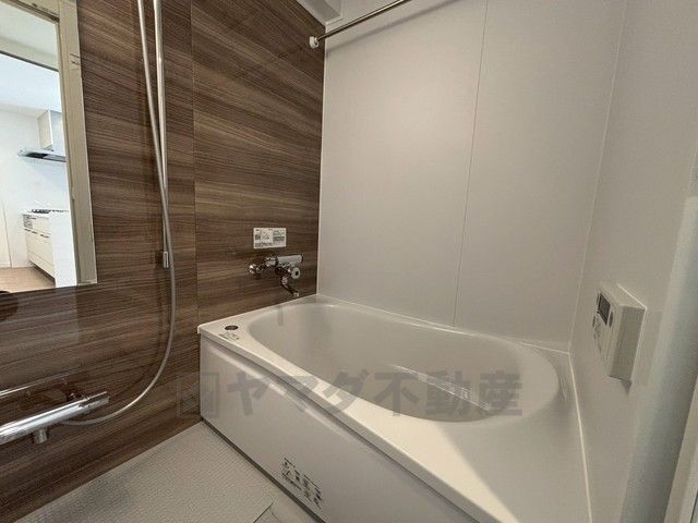 木目調アクセントパネルが落ち着いた雰囲気を演出するバスルーム。ゆったりとした浴槽で一日の疲れを癒せるほか、手元操作のしやすい水栓や清掃性に配慮した設計で、毎日のバスタイムを快適にサポートします。