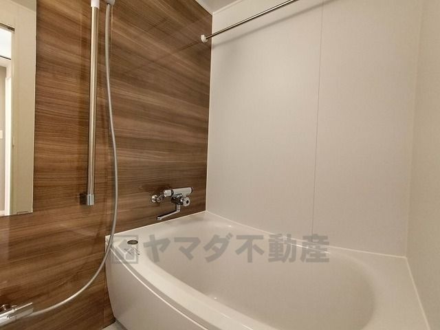 木目調パネルが上質な雰囲気を演出するバスルームは、一日の疲れをゆったり癒せるくつろぎ空間。浴室上部には洗濯物を掛けられる物干し竿が設置されています。