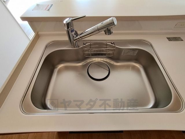 広々としたステンレスシンクには、洗剤やスポンジを収納出来るラック付き。広さも確保しているので、大きなお鍋も洗いやすいです。