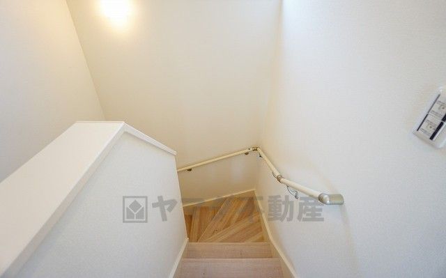 同仕様写真。小さなお子様やご高齢の方でも安心できる、手すり付き階段。段差も低めで設定されており、安全性にも優れています。
