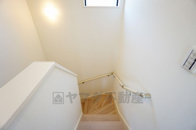 同仕様写真。小さなお子様やご高齢の方でも安心できる、手すり付き階段。段差も低めで設定されており、安全性にも優れています。