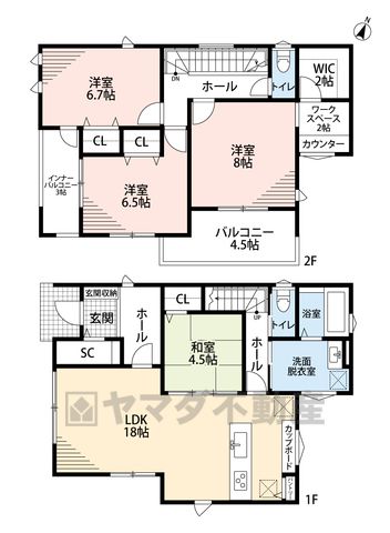 LDK18畳(1F)、和4.5畳(1F)、洋6.5畳(2F)、洋6.7畳(2F)、洋8畳(2F) |