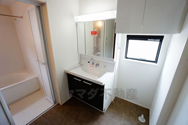 同仕様写真。三面鏡つき洗面台。鏡裏にたっぷりとした収納スペースがあります。鏡を閉めてしまえば小物は見えないため、スッキリとした印象の洗面台にできます。