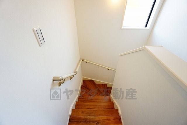 同仕様写真。小さなお子様やご高齢の方でも安心できる、手すり付き階段。段差も低めで設定されており、安全性にも優れています。