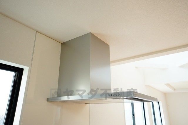 風量が弱・強と切替え可能なレンジフードが調理中の煙をしっかり吸い込みます。手元を照らすライト付きです。