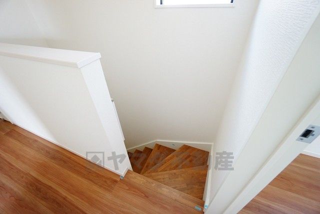 小さなお子様やご高齢の方でも安心できる、手すり付き階段。段差も低めで設定されており、安全性にも優れています。