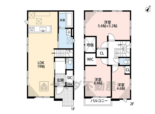 LDK19畳(1F)、洋4.6畳(2F)、洋8.4畳(2F)、洋10.8畳(2F) |