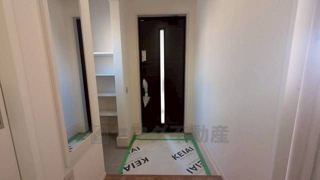 白を基調とした明るい玄関です。全身鏡付きで、お出かけ前にコーディネートのチェックが出来ますね。