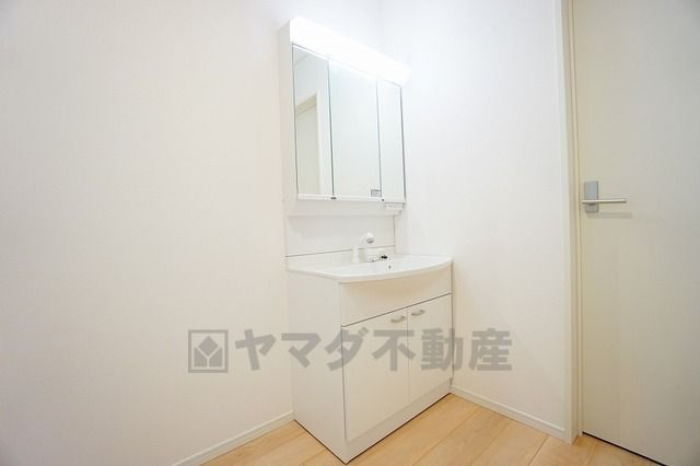 三面鏡つき洗面台。鏡裏にたっぷりとした収納スペースがあります。鏡を閉めてしまえば小物は見えないため、スッキリとした印象の洗面台にできます。