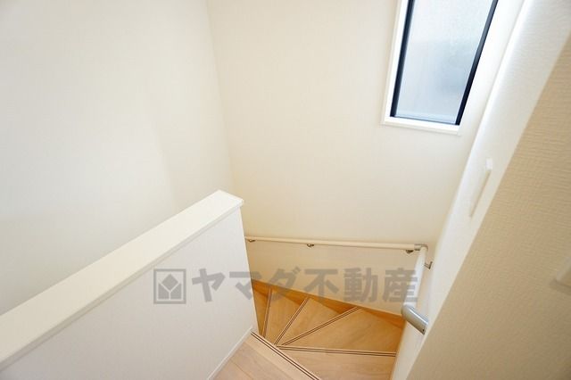 小さなお子様やご高齢の方でも安心できる、手すり付き階段。段差も低めで設定されており、安全性にも優れています。