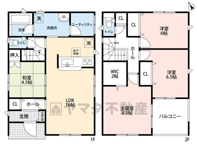LDK16畳(1F)、和4.5畳(1F)、洋6畳(2F)、洋6.5畳(2F)、洋8.5畳(2F) |